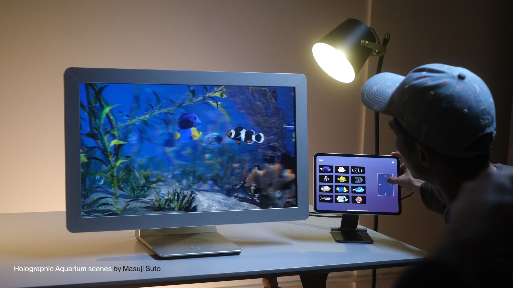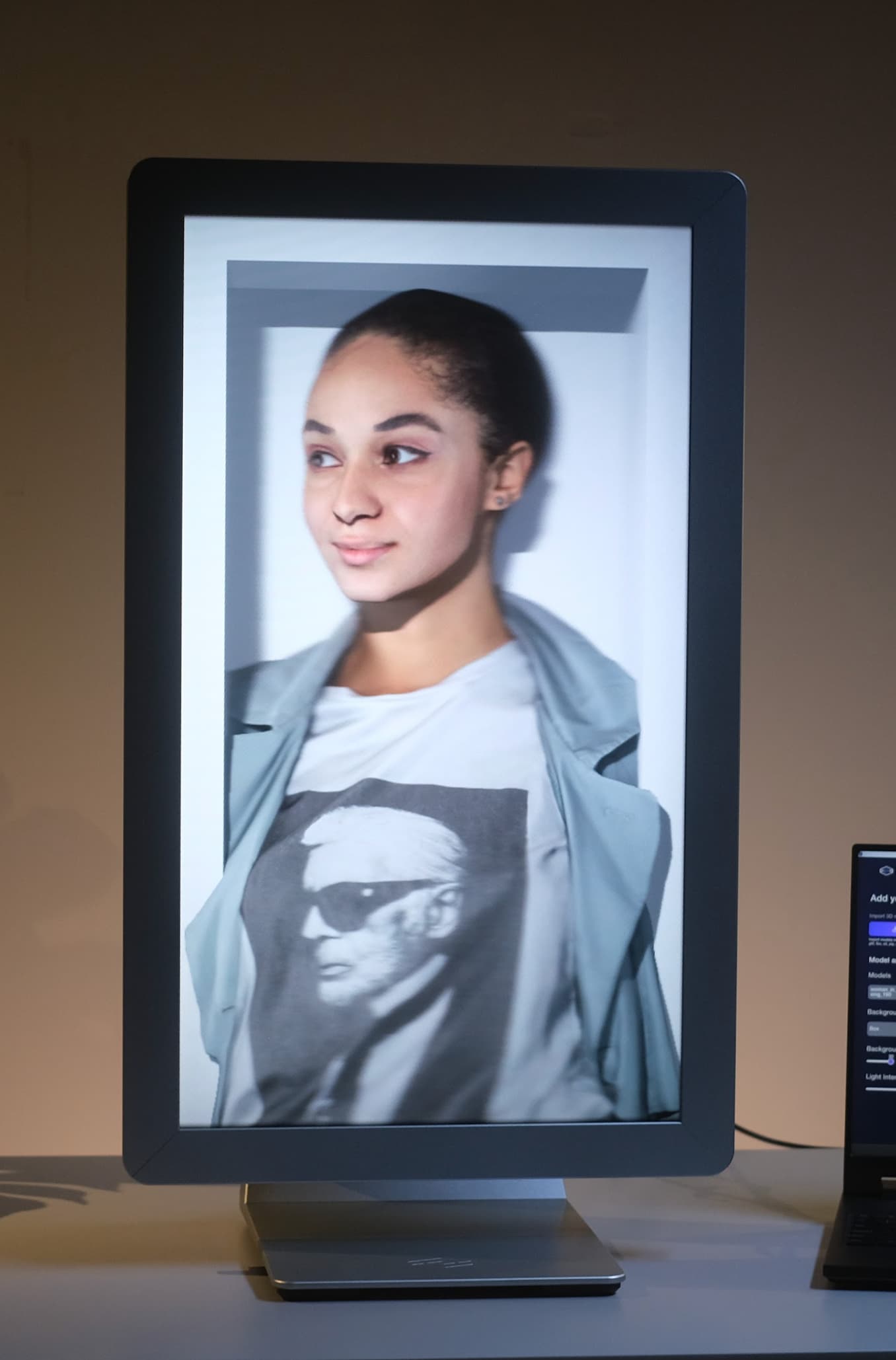 An iPad 11" (M4) on an iPad stand that can be directly attached to the base of a Looking Glass 27" Light Field Display to provide power, computation, and an interface